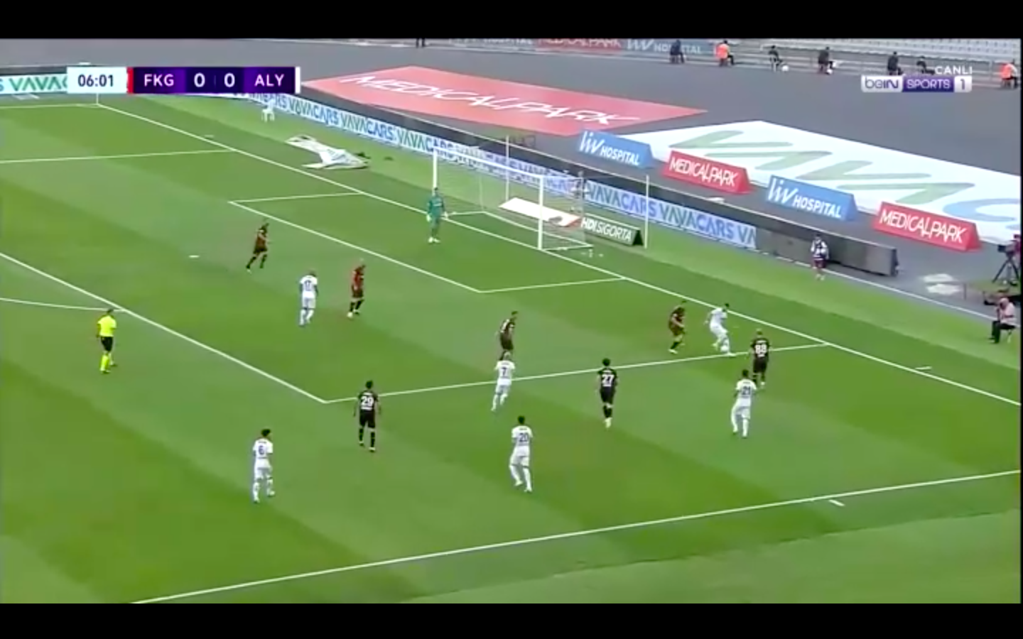 In a deeper central area, Alanyaspor also had a short free-kick situation where they did not have a single player positioned in the centre of the box. They had three players positioned around the free-kick, 4 players positioned on the left side of the box as well as two players on the right side of the box. On the left flank, it was a 4v4 situation while on the right, it was a 2v2 situation as the opposition had two supporting players for each side positioned in the centre as well as a wall of one player and another defender positioned outside the box. For the free-kick one player made a dummy run and rolled the ball to a teammate to work a pass to the left where a teammate dropped deep to receive possession as his teammates made runs into the box for the player to loft a delivery to the right as a player at the back-post played the ball into the centre as an attacker lost the initial aerial duel. Alanyaspor were positioned perfectly to regain possession outside of the box to send a shot high and wide from range. Despite not being able to score from the situation, the design of the free-kick was phenomenal as after the initial ball into the box, an attacker from the left made a run towards the near post, dragging a defender out of position and clearing a space in the centre of the box as a better delivery could have resulted in a goal. Alanyaspor could have also had a late run into that area for a teammate to apply the finish. However, Farioli’s side were perfectly positioned to regain possession in the case of a deflection.